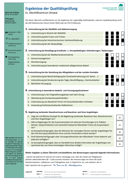 Unser Haus wurde vom 06.-07.10.2025 durch den Medizinischen Dienst der Krankenkassen überprüft. Die Ergebnisse entnehmen Sie bitte nebenstehenden pdf-Datei durch anklicken.
